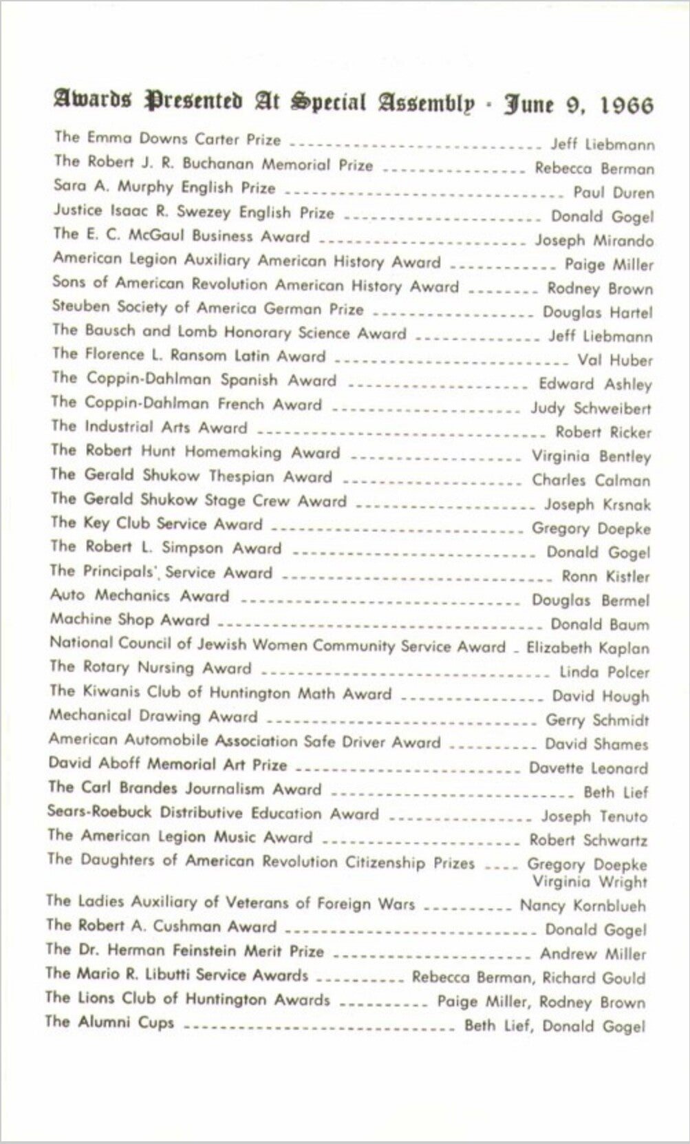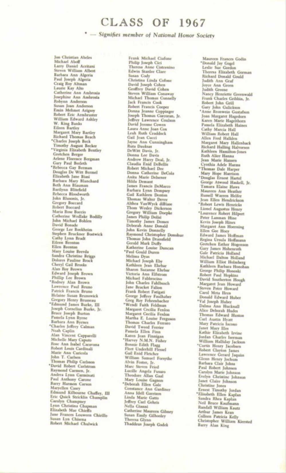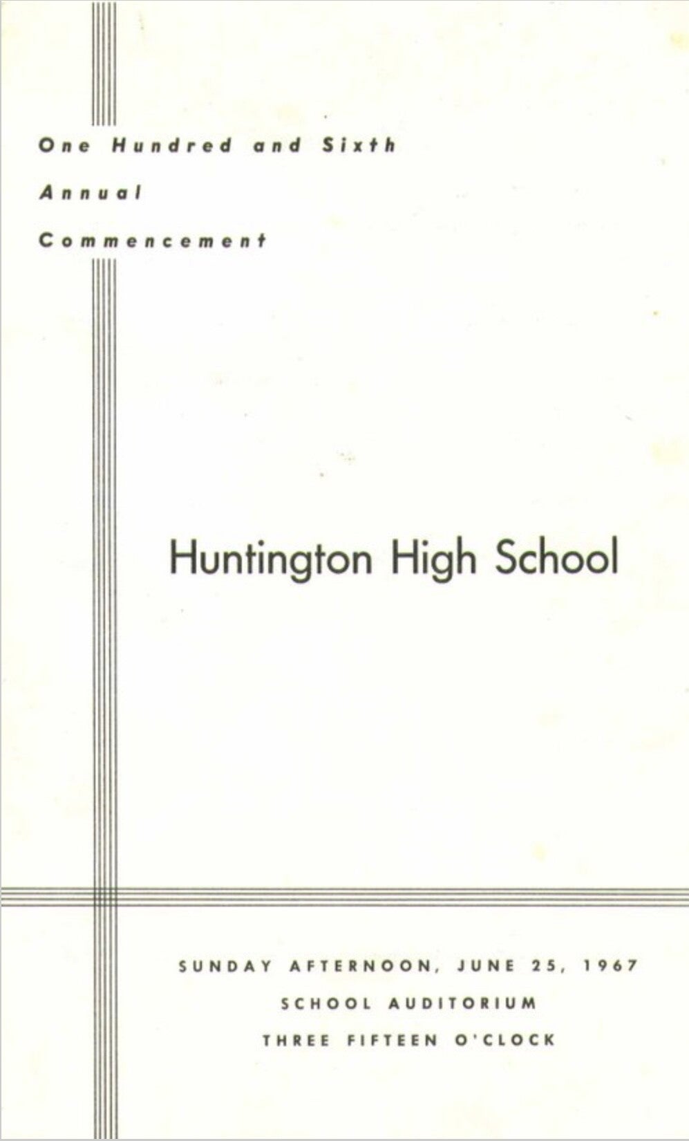 During the graduation ceremony of Huntington High School's Class of 1967, on June 25, 1967 in the HHS auditorium, there came a point at which the graduating seniors were to receive their diplomas on stage. The seniors had been instructed to clearly and legibly print their first, middle and last names on 3x5 cards, which they would furnish as they reached the podium, to avoid any confusion that might have been caused by a long line of graduates arriving out of order from a pre-written list of names.