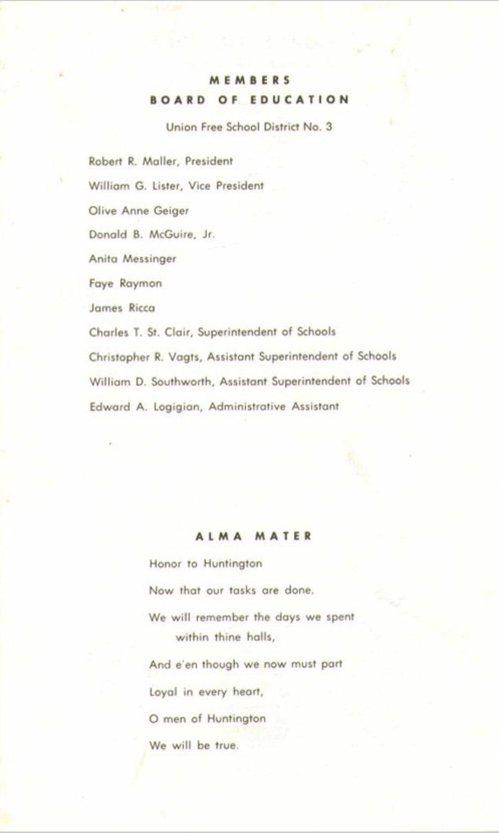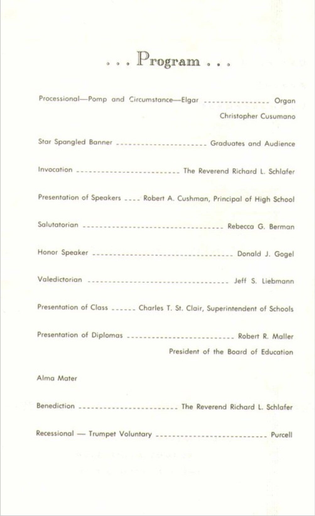 Upon approaching the podium, each student handed his or her 3x5 card to the principal, Mr. Robert Cushman, who read each name into the microphone exactly as presented to him; the student then proceeded on to the superintendent of schools, Dr. Charles St. Clair, and the president of the board of education, Mr. Robert Maller, who handed out the still-empty diploma cases.