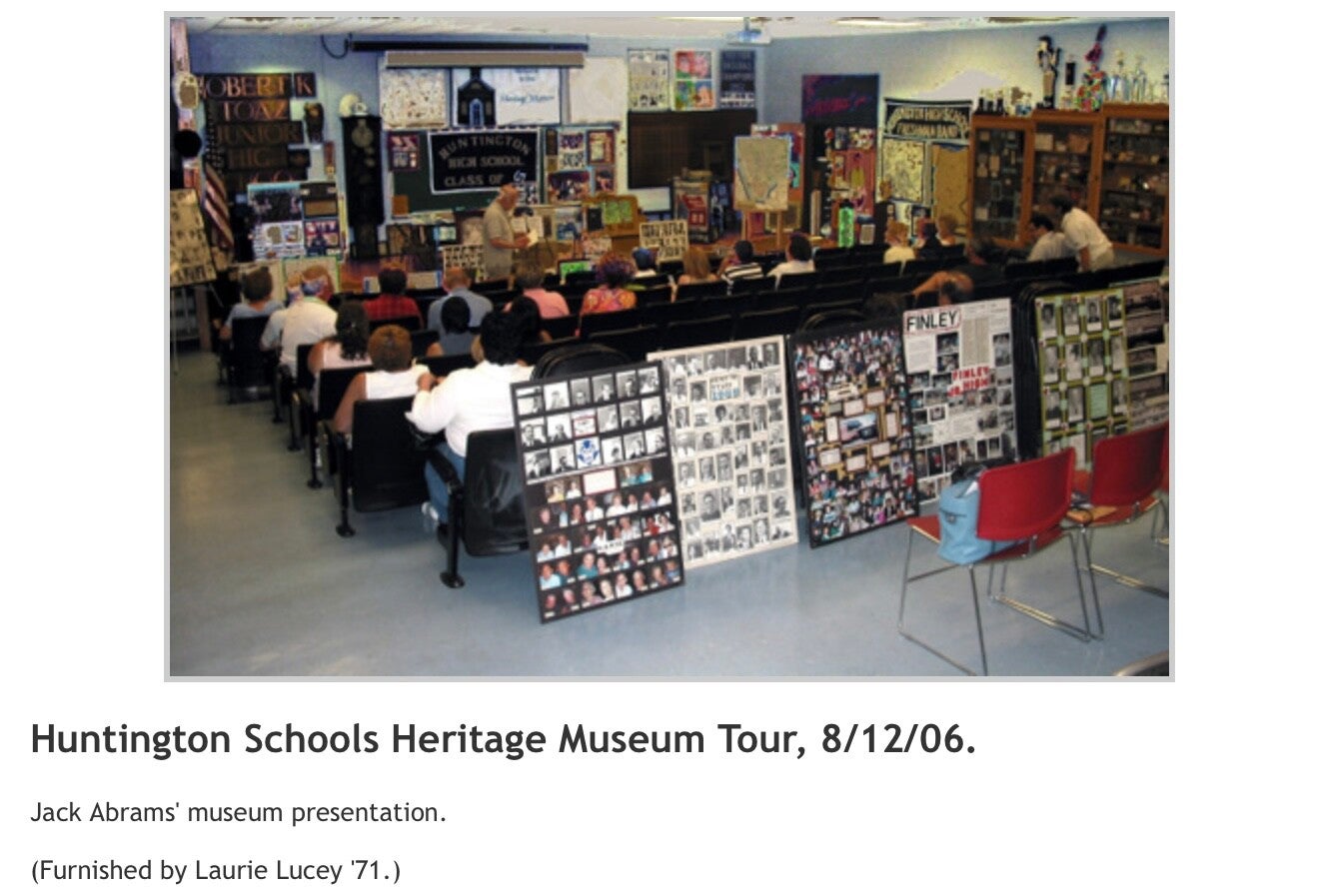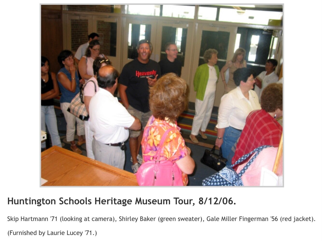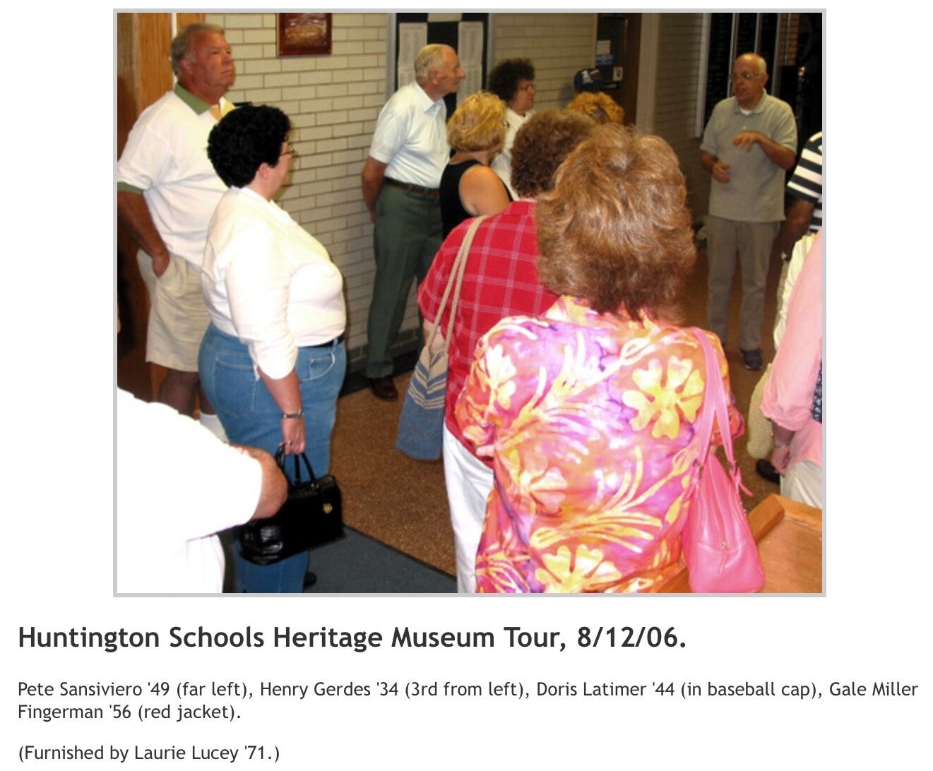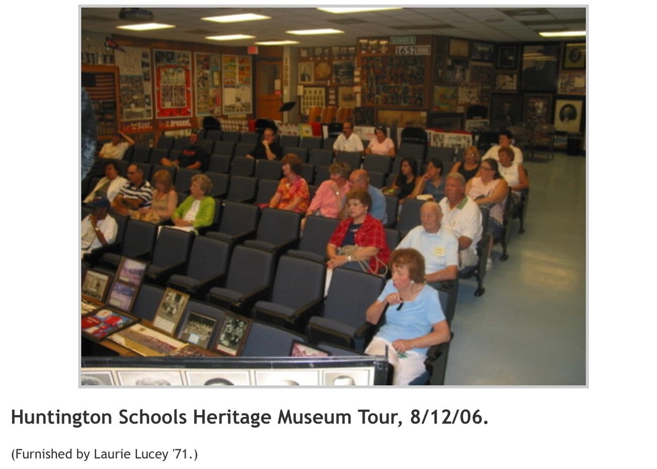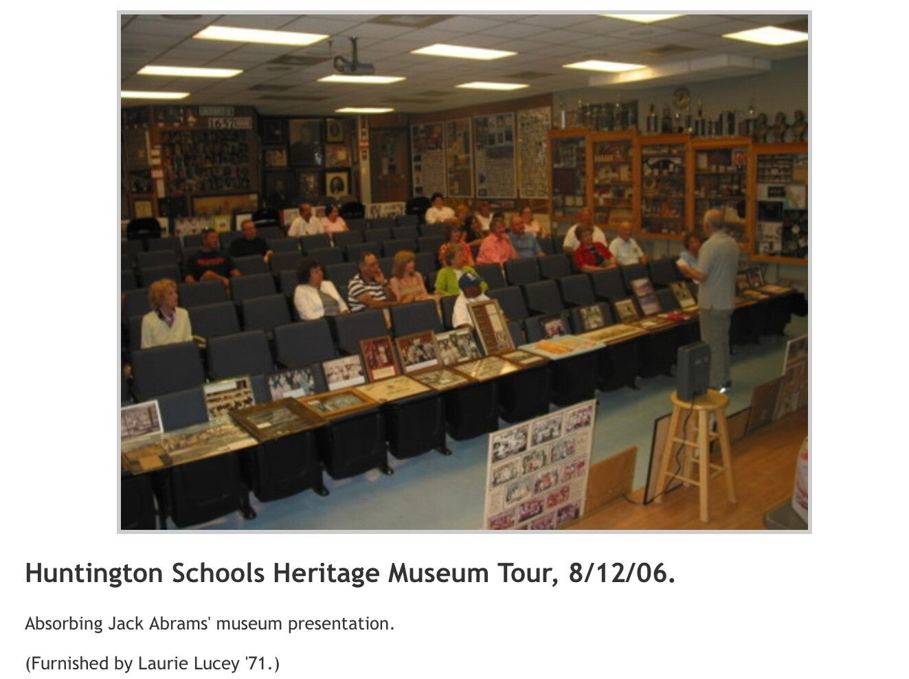 Saturday, August 12th, noon to 2:00 pm: Tour of Huntington Schools Heritage Museum, Huntington High School. Tour Guide: Jack Abrams, Curator, former teacher & principal.